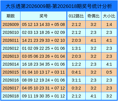 上期回来:大乐透2026018开奖号码为:09、11、19、30、35 + 01、12。